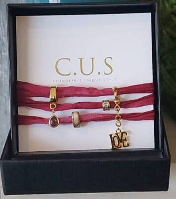 Changeable Unique Style sieraden, kan om de hals of pols. Een uniek juweeltje met C.U.S lint en verschillende soorten kralen: C.U.S® DQ Grieks keramiek schuivers, DQ metalen kralen, swarovski kralen, acryl letterkralen of een hanger met oog.