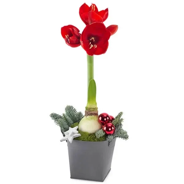 Een rode amaryllis in een donkere pot, om uw beste wensen naar iemand te sturen. Een kleurrijk kerstcadeau dat lang mooi blijft.