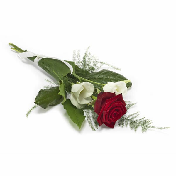 Klassiek handboeket met één rode roos, witte lisianthus, seizoensbladgroen en wit lint. Een klein handboeket om op de kist te strooien als laatste groet.