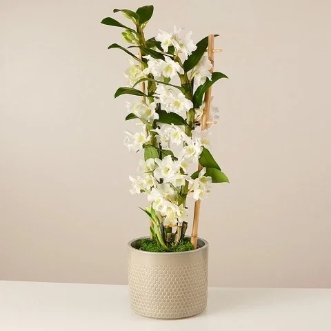 Dendronium, ook bekend als bamboe-orchidee, is een favoriete orchideeënsoort dankzij de prachtige klokvormige bloemen en rechtopstaande vorm. Deze volle, volslanke plant komt uit tropische regenwouden en zal je dus erg dankbaar zijn als je de bladeren af en toe besproeit.