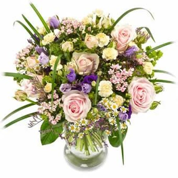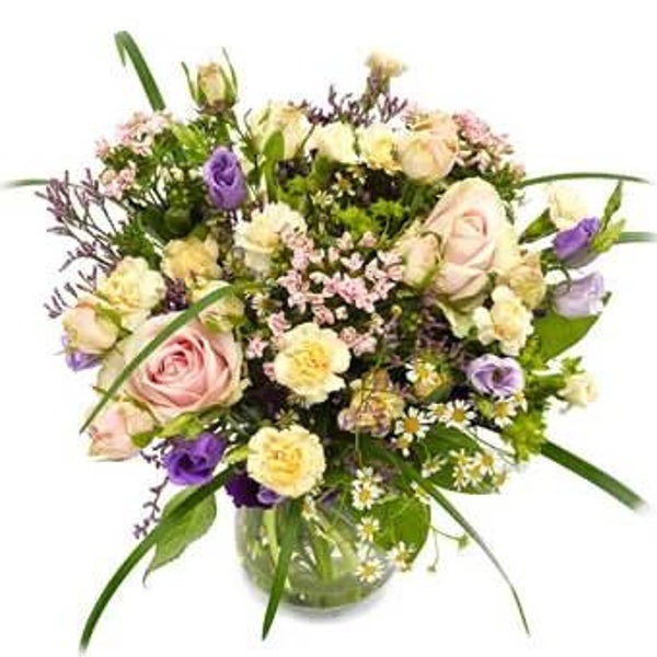 in pasteltinten, zacht-roze, licht geel, paarse tinten: rozen, geel/witte tanacetum, dianthus, limonium en bouvardia