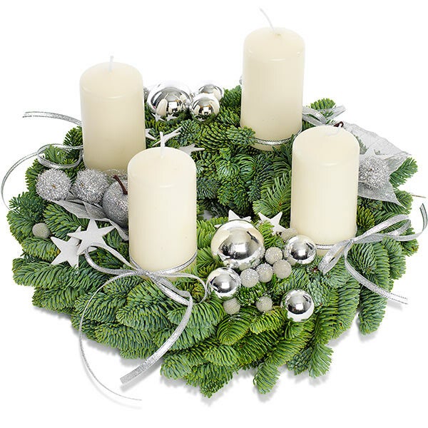 Witte en groene adventskrans met 4 grote witte kaarsen gemaakt met nobilis kersttakken klein zilverkleurige lint, zilverkleurige brunia, en zilverkleurige kerstdecoratie zoals kleine sterren, dennenappels en kerstballen.