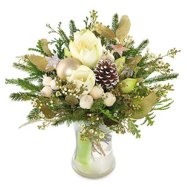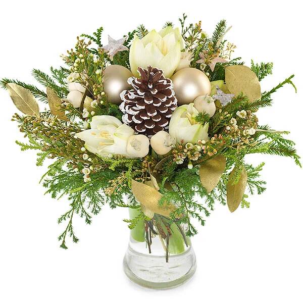 Rond boeket in witte en gouden tinten gemaakt met amaryllis, waxflowers, besneeuwde dennenappels, goudkleurige eucalyptus, cipres, seizoensgroen en een goudkleurig kerstbal